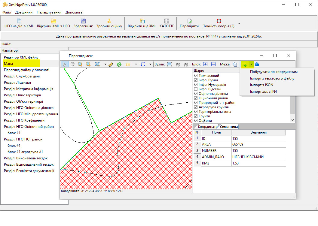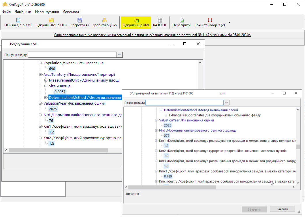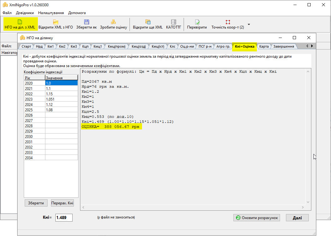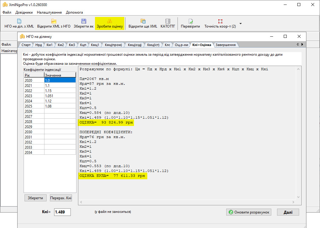 • Для будь-якого файлу можна перевірити вказані в ньому коефіцієнти і розрахувати нормативну грошову оцінку ще раз з використанням правильних коефіцієнтів індексації.